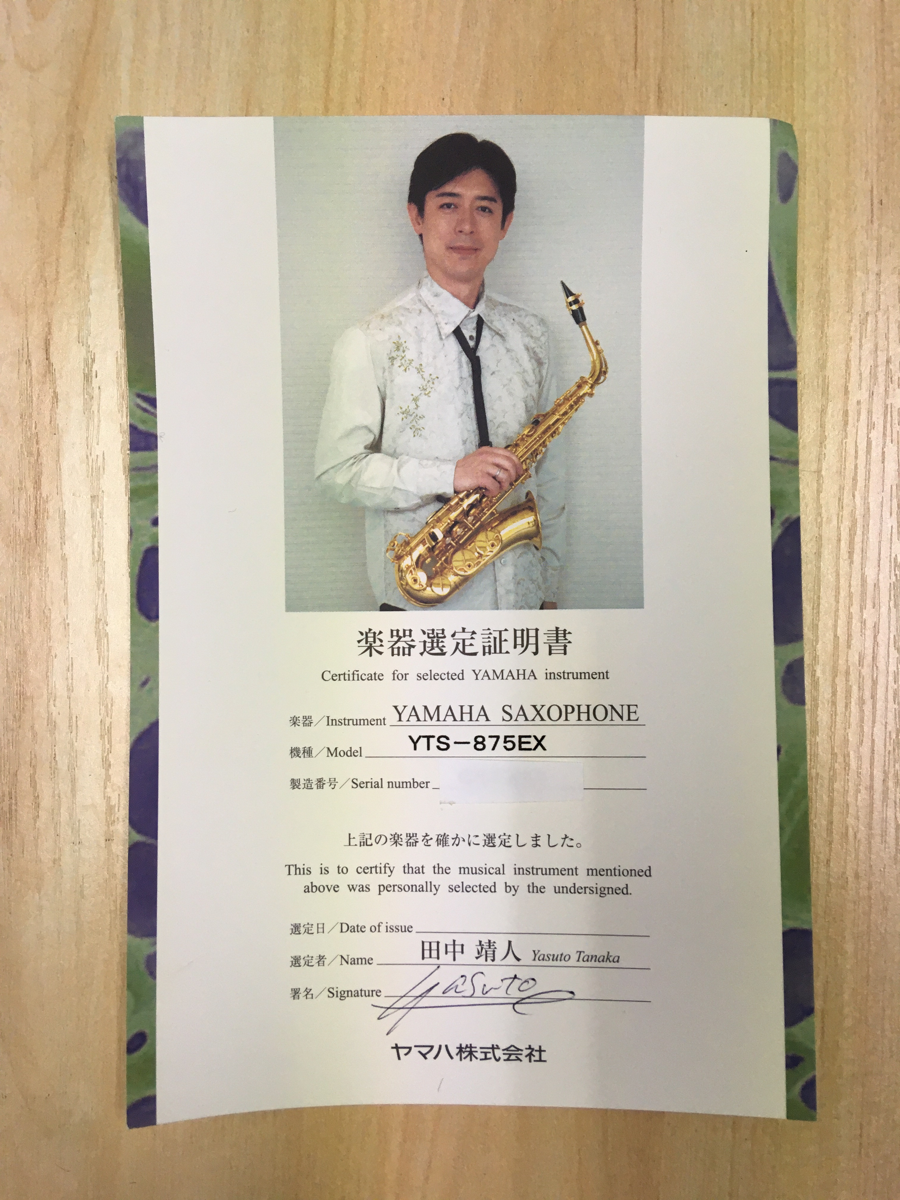 新品購入時の田中靖人さん選定書付き